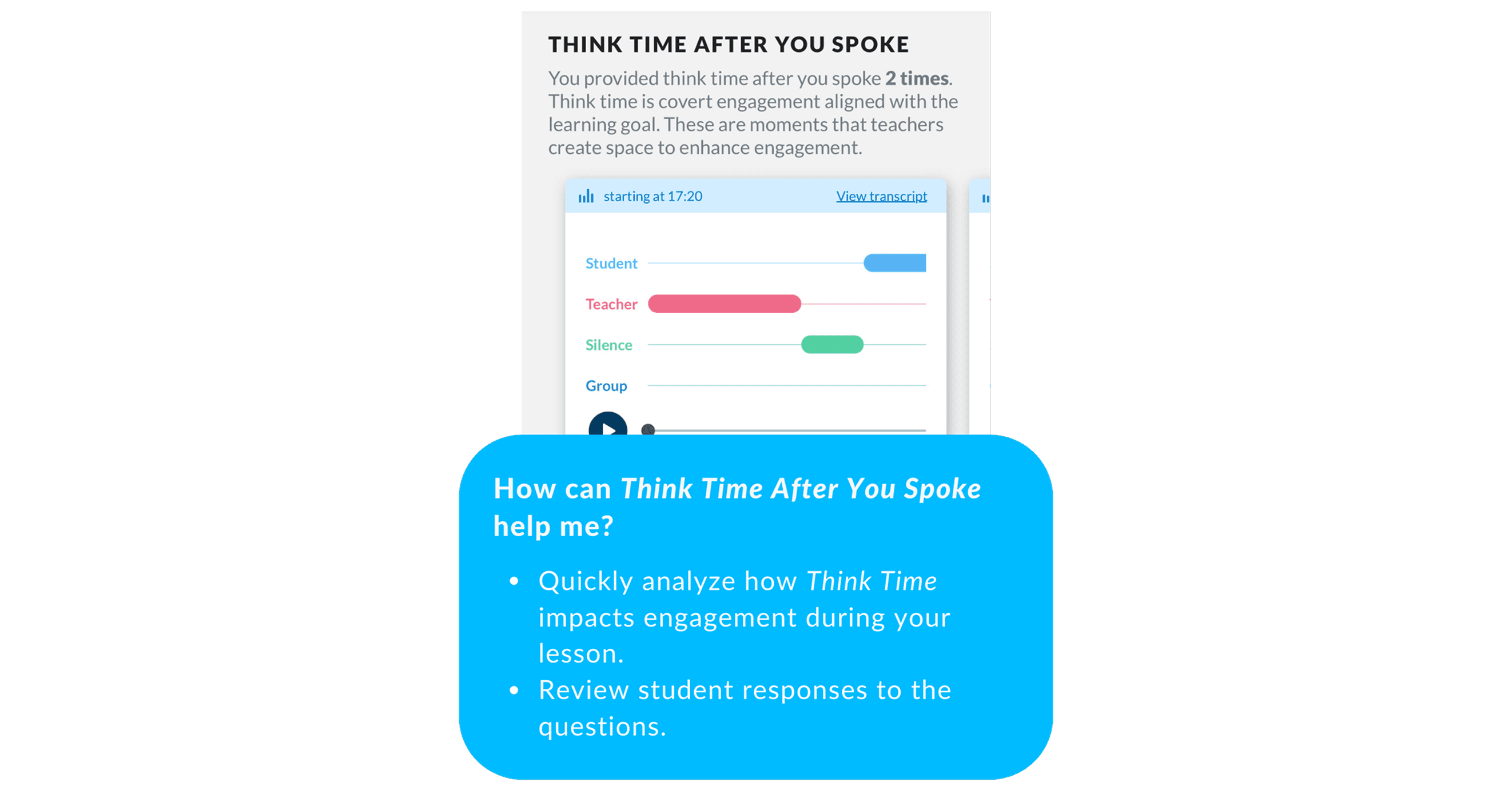 Our AI technology makes it easy to collect evidence of how your use of Think Time impacted classroom discussions. The best part: getting this kind of feedback doesn’t require any additional work from you. Just record your lesson on TeachFX, and —boom! — when class is over we’ll send you a report that flags the moments when you used Think Time. Easily pinpoint what’s working for your students. Get private, personalized support to empower you to do more of what’s working to elevate your students’ voices.