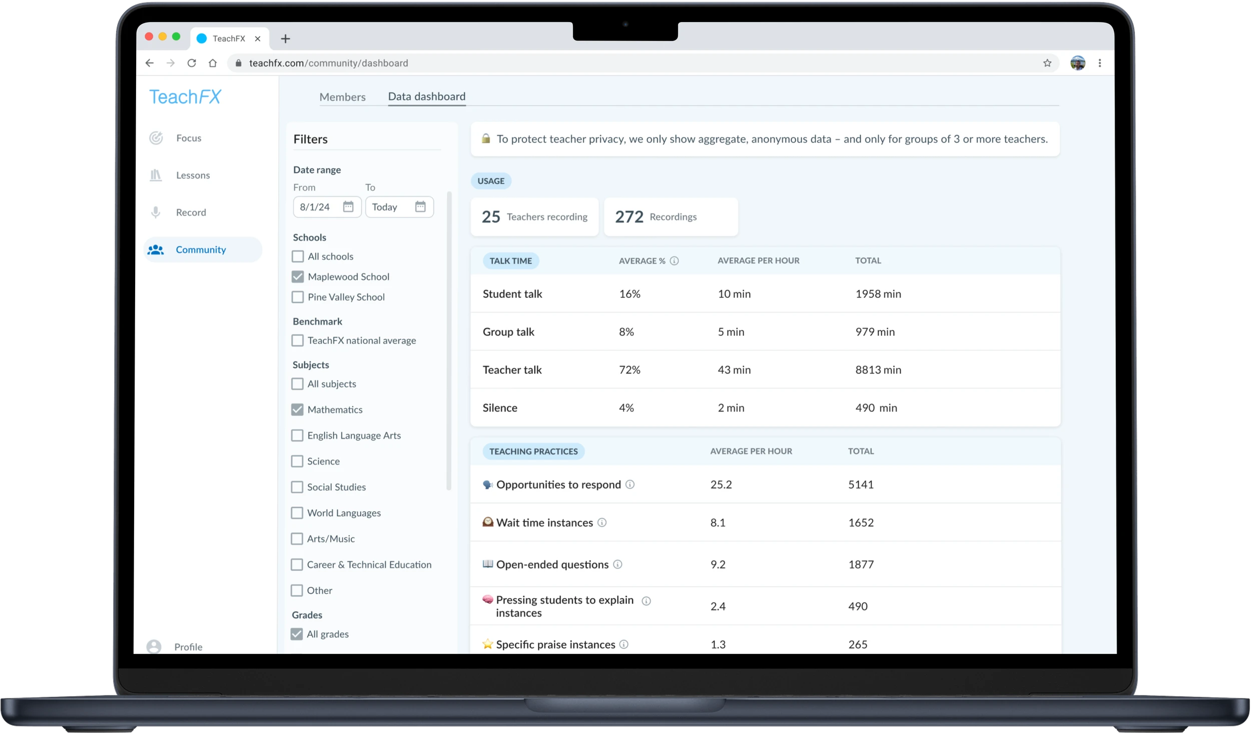 Instructional leaders use TeachFX to extend the capacity of each instructional coach, support curriculum adoption, and make professional learning time more focused and impactful. Aggregate TeachFX data helps instructional leaders understand what's happening in the classroom and better allocate limited professional development resources.