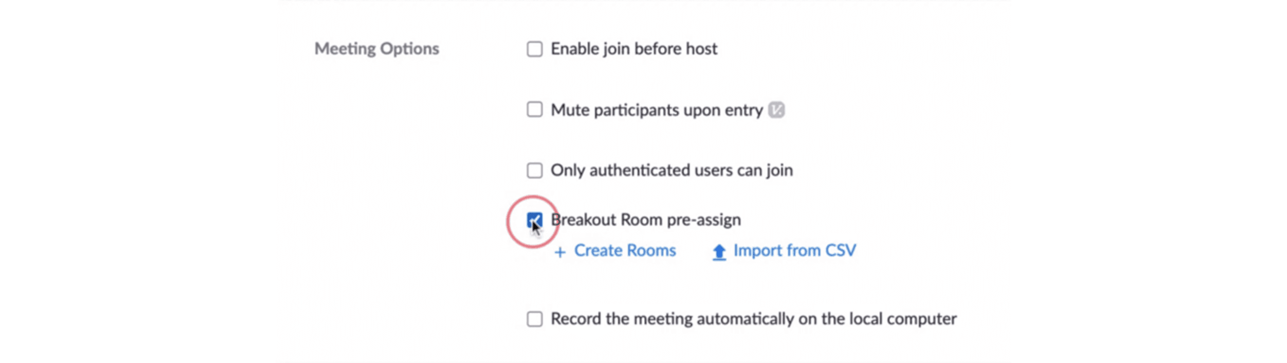 In the Meeting Options section, select Breakout Room pre-assign. Click Create Rooms.