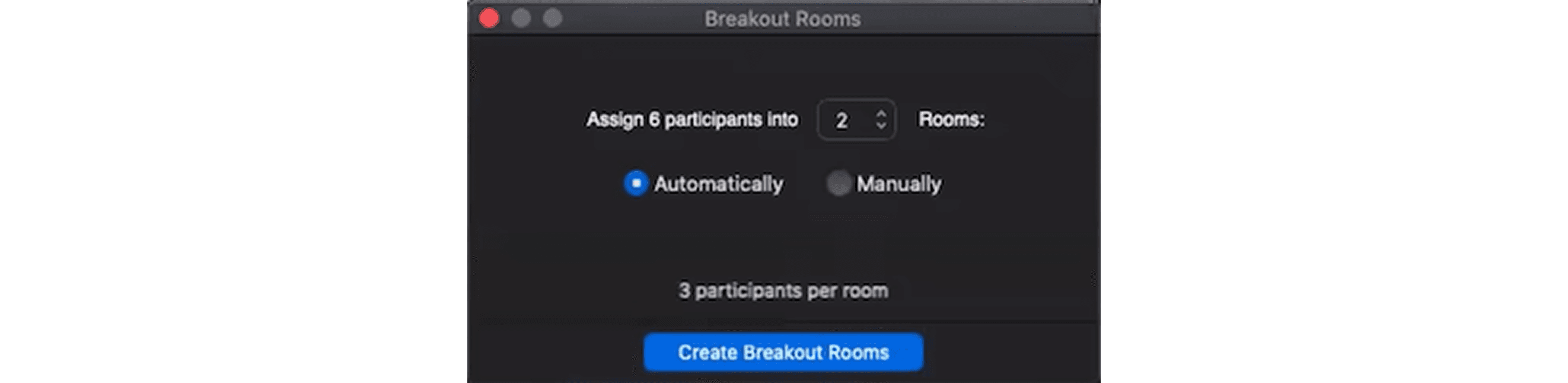 If you select Automatically, Zoom will assign students to breakout rooms randomly based on the number of rooms. Once breakout room assignments are generated, you will have the option to manually swap students between rooms before sending everyone off into their breakout rooms.
