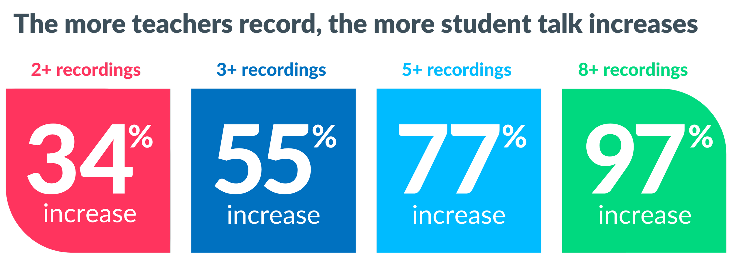 Student talk has increased dramatically. Teachers who recorded 3 or more lessons increased the average amount of student talk by 55%. And, the more teachers use TeachFX, the more their student talk has increased. Teachers who’ve used the app eight or more times have seen student talk in their classrooms nearly double.