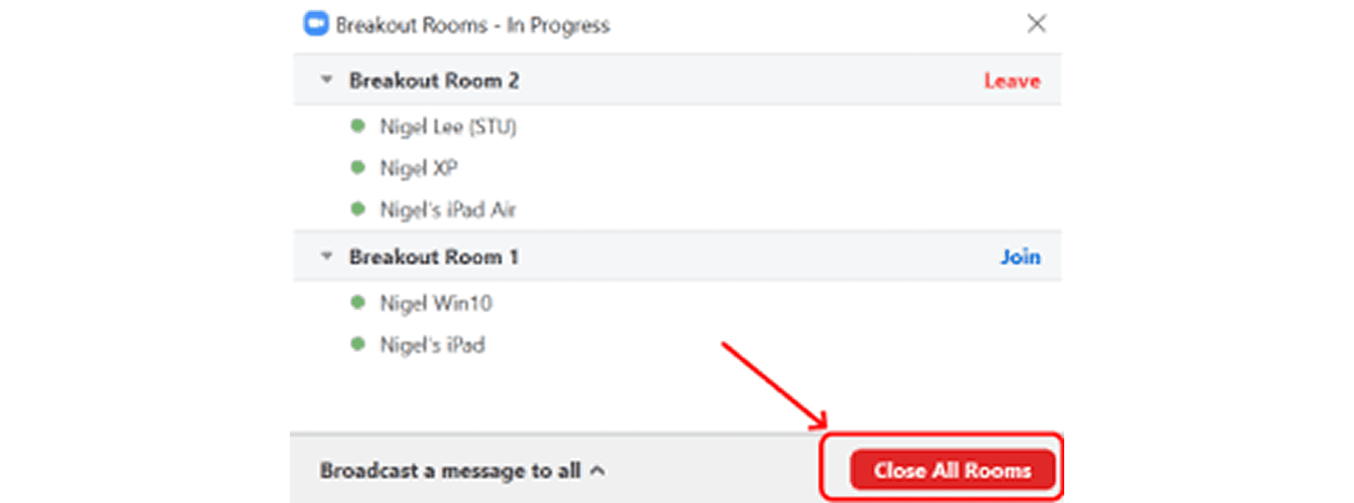 Simply click the Close All Rooms button, and your students will see a 60 second countdown. when the countdown is up, everyone will automatically be pulled back into the main meeting room.
