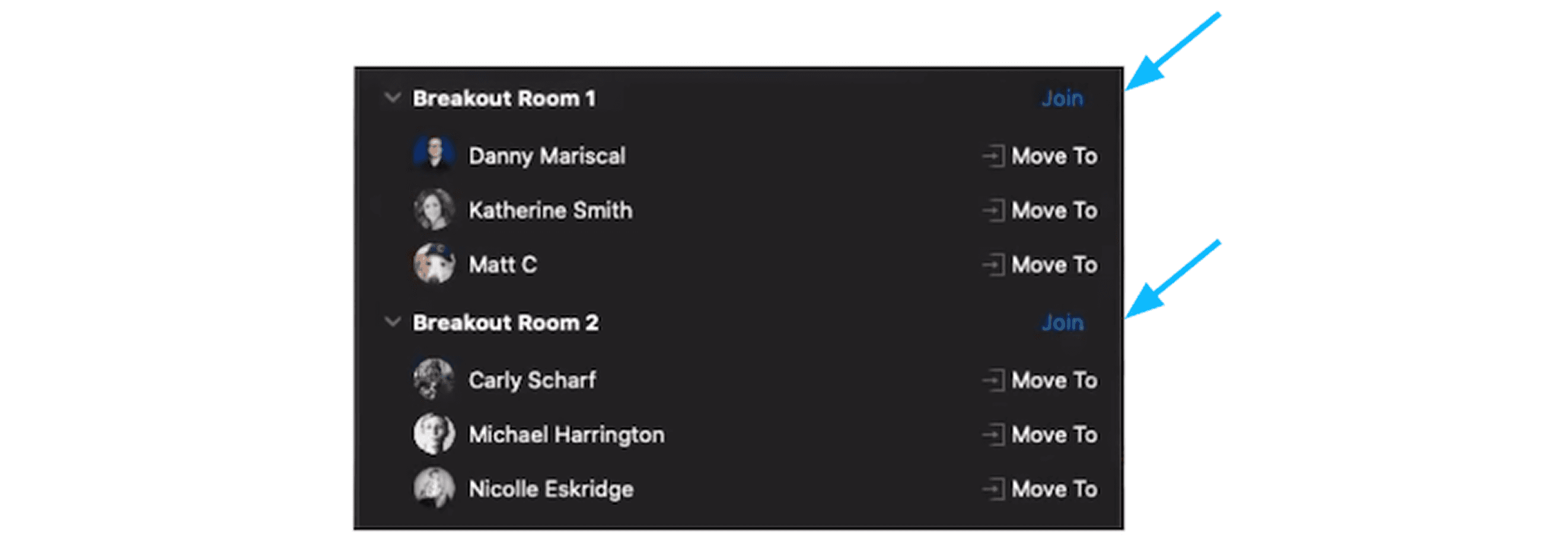 You can join any breakout room to listen in on conversations and facilitate discussion: