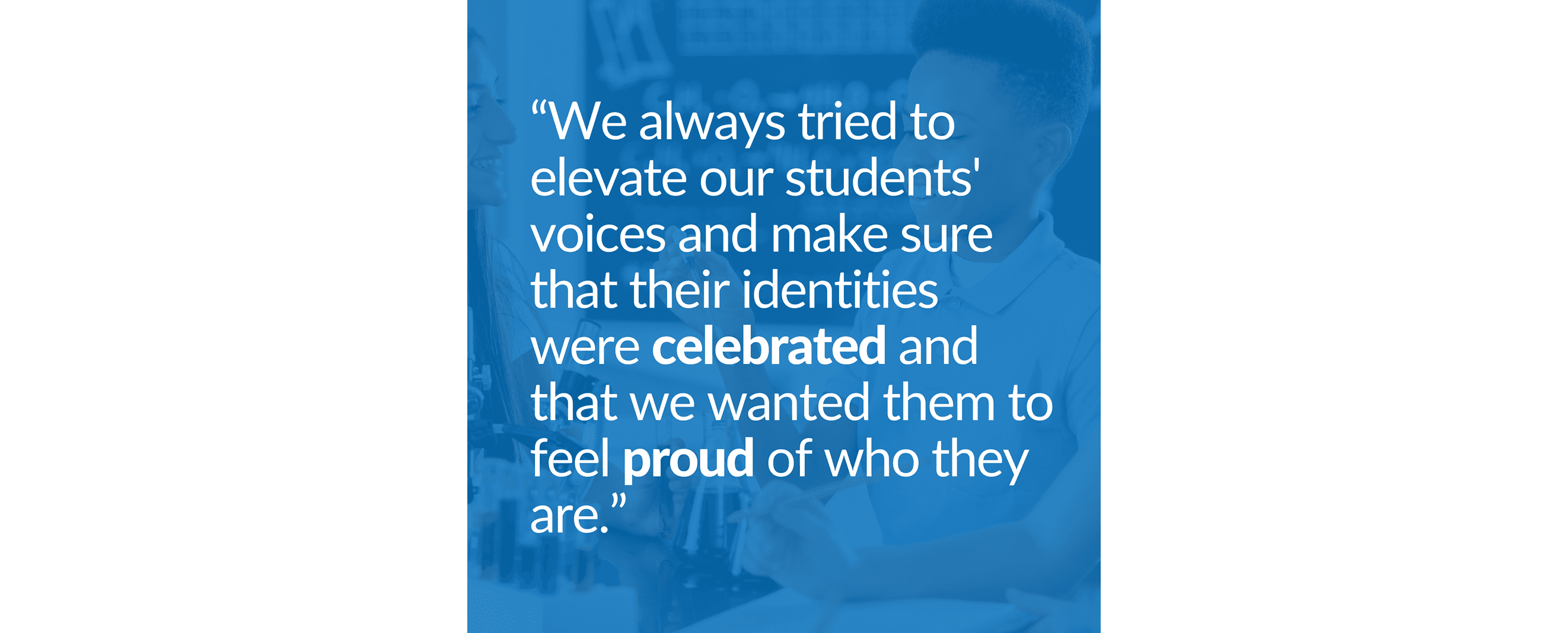 We always tried to elevate our students' voices and make sure that their identities were celebrated and that we wanted them to feel proud of who they were, feel a sense of belonging, feel connected to their community, and ultimately to love school.