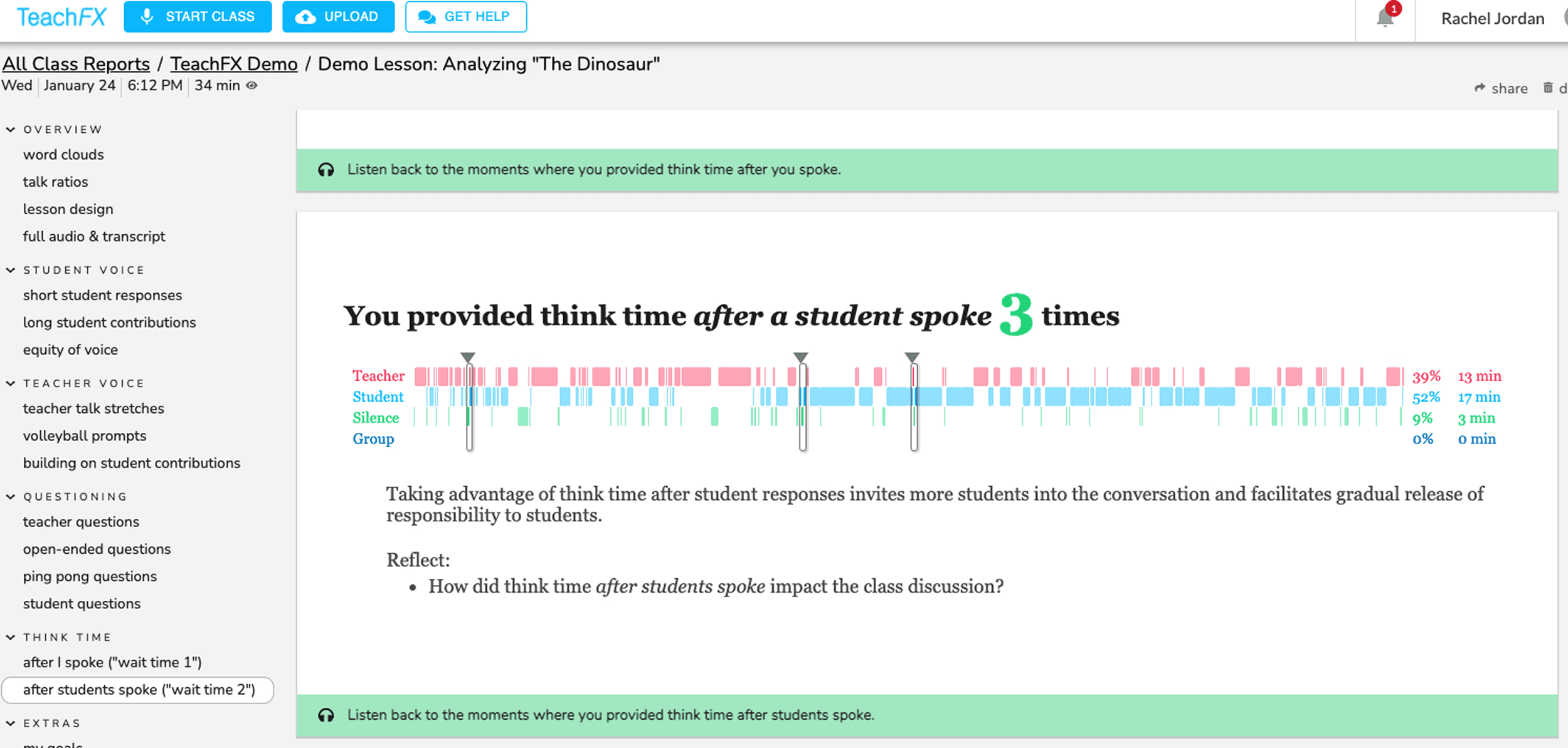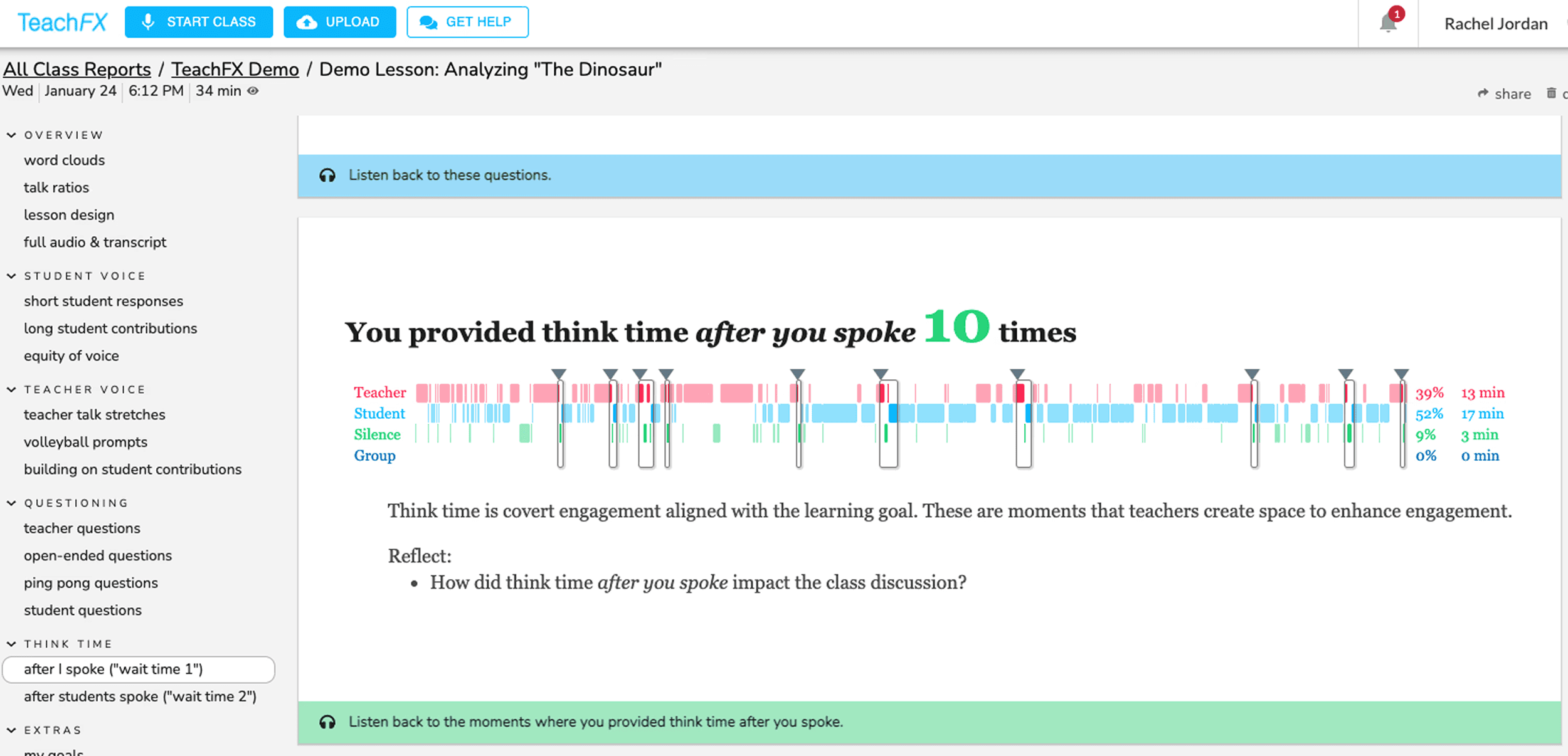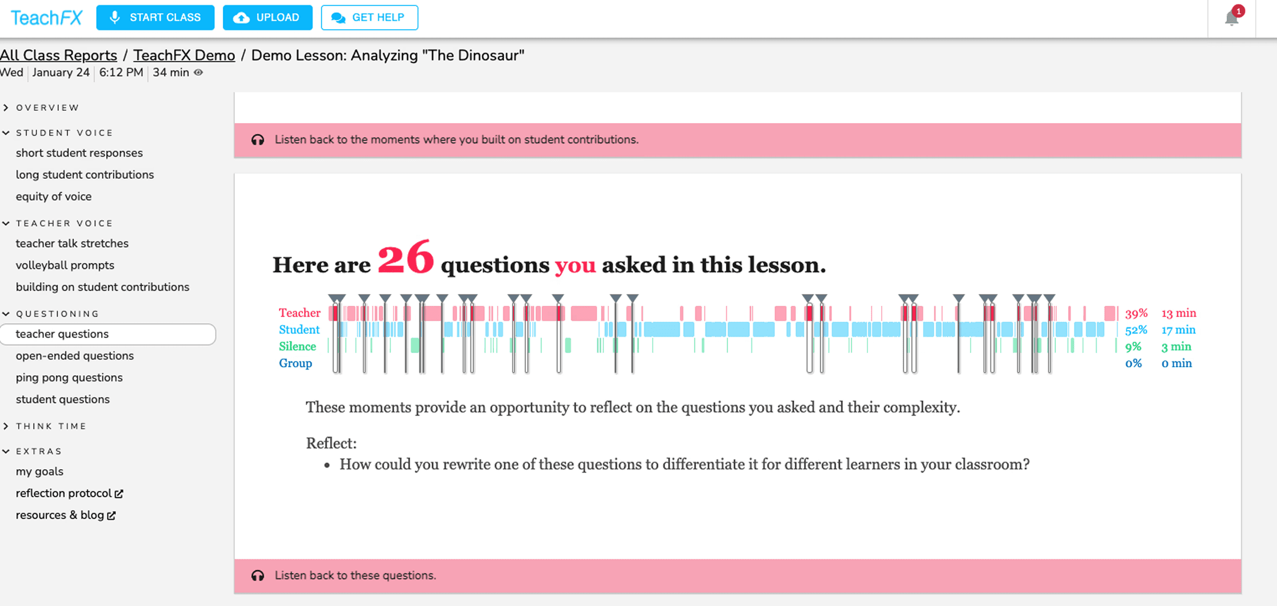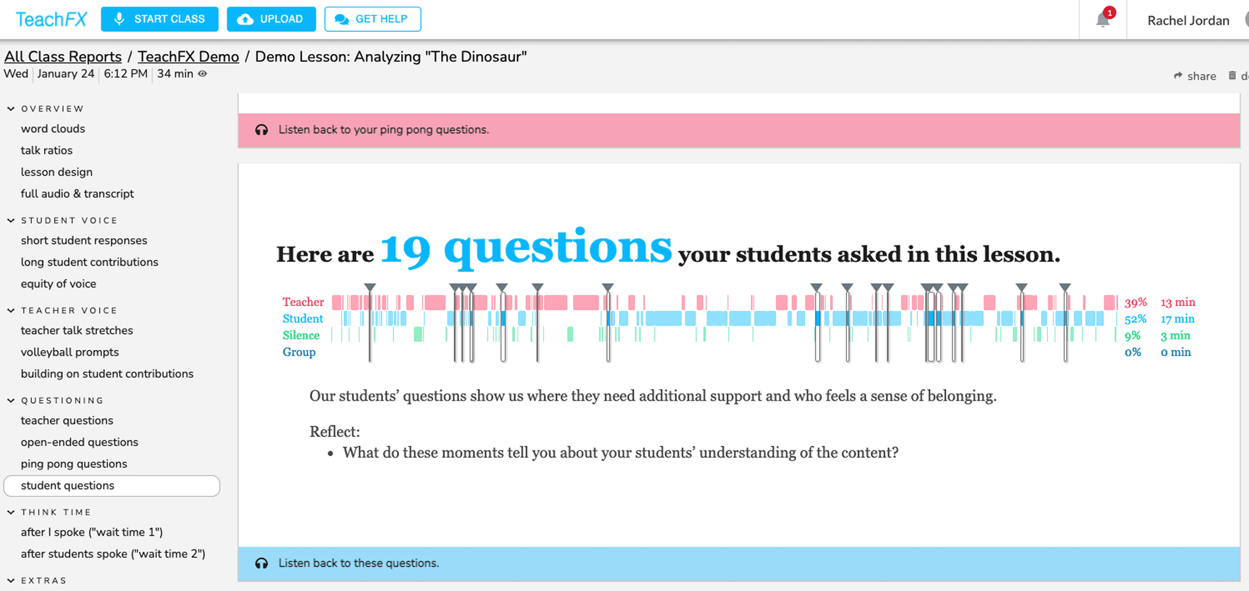 Teachers and instructional coaches often find TeachFX when they’re looking for a way to better understand and improve on their use of questioning techniques in the classroom. The new Questioning insights in TeachFX make it easier than ever to see exactly how you’re using these practices, and even to listen back to those key moments in your lesson.