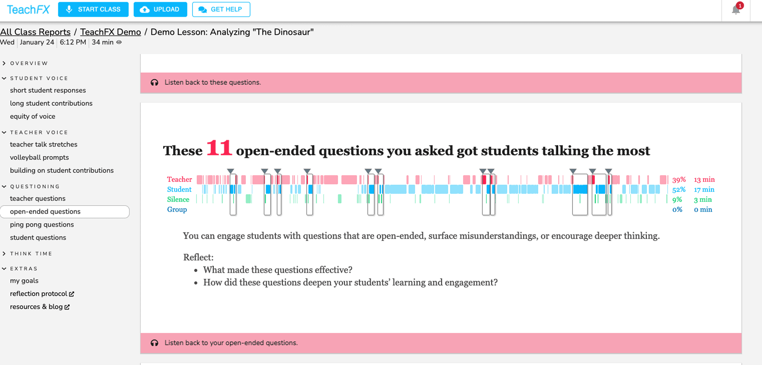 And now, the student voice, teacher voice, and questioning insights in your TeachFX class reports help you see visible evidence of the dialogical patterns and instructional practices that support deeper learning in your classroom.