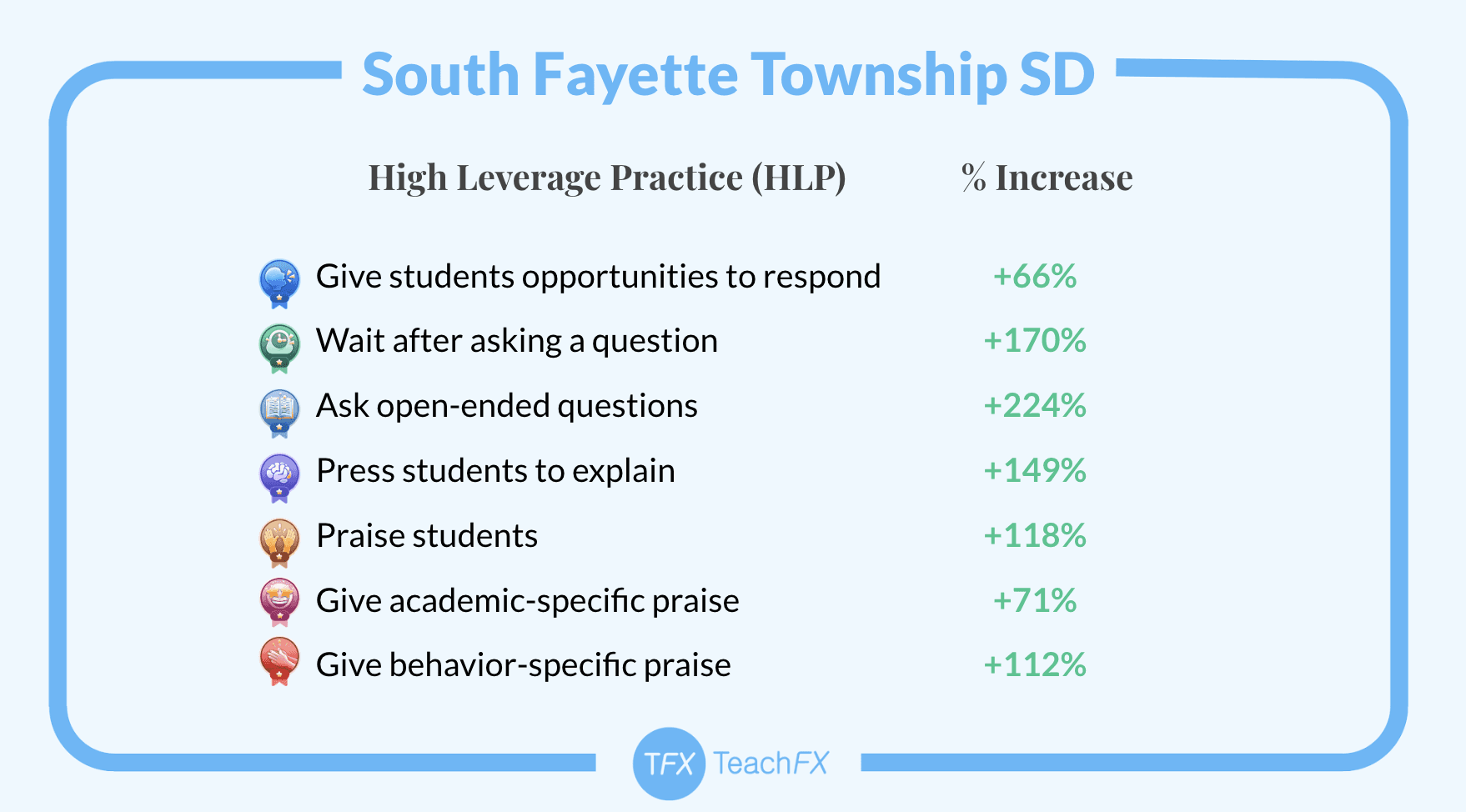 These teacher awakenings are visible in aggregate growth metrics, too. Across South Fayette classrooms, the numbers tell a clear story of growth in high-leverage teaching practices – teacher moves most strongly linked to an increase in student voice and engagement.