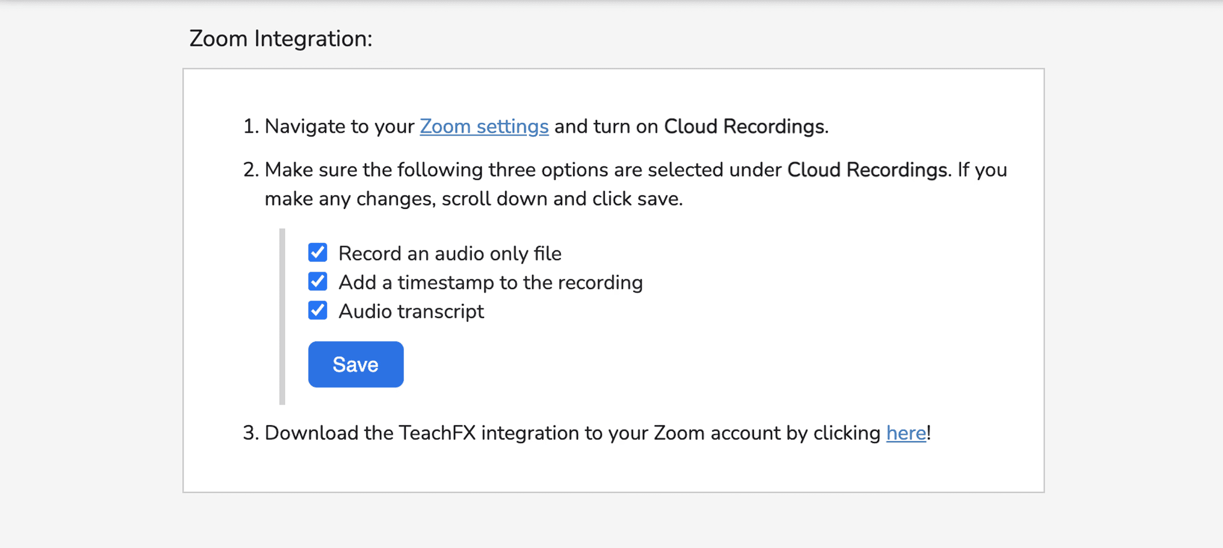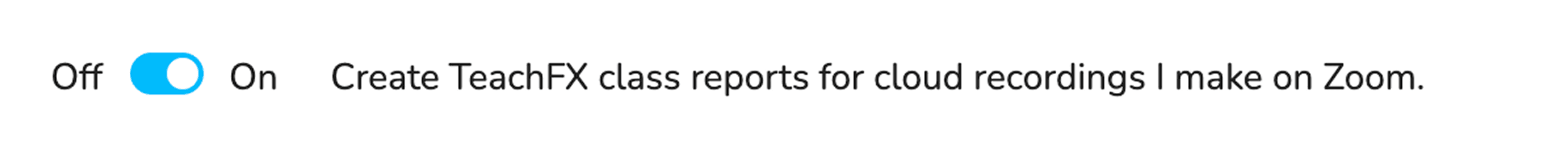 To enable the integration for their individual Zoom account, they simply need to log in to TeachFX and change one setting.