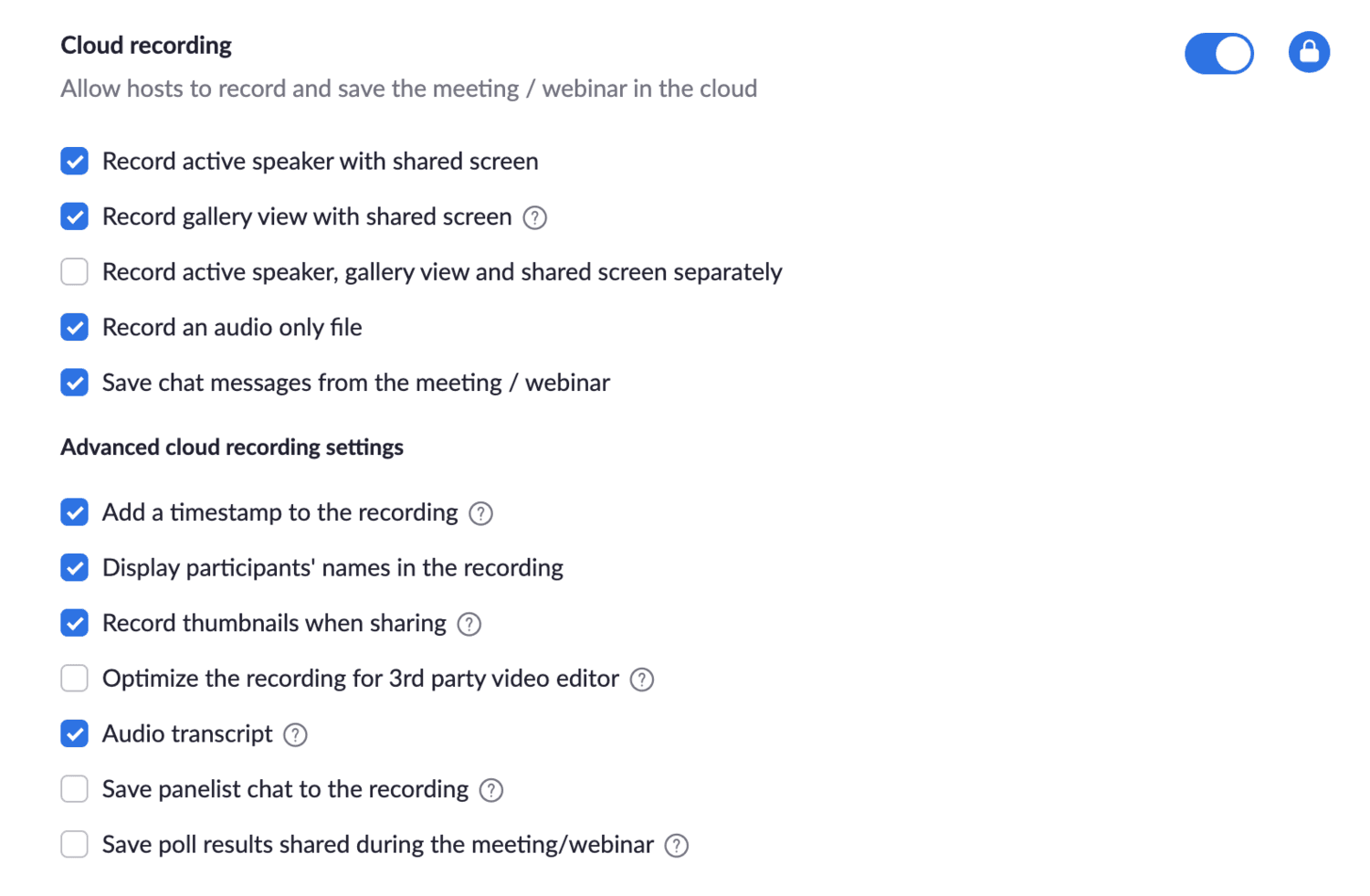 Make sure that, in your Zoom Cloud Recordings settings, your settings match what’s shown here: